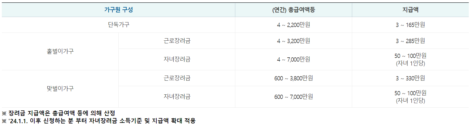 가구원 구성에 따라 연간 부부합산 총소득금액1)이 기준금액(단독22백만원, 홑벌이32백만원, 맞벌이38백만원) 미만이어야 하며, 총급여액 등2)에 의하여 장려금 산정