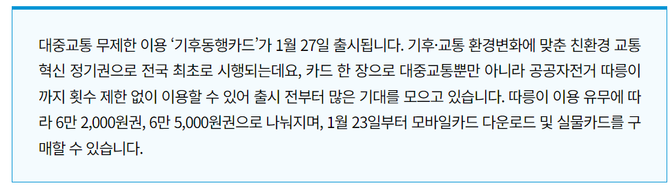 2024년 1월 27일부터 서울시 대중교통 무제한 이용권인 '기후동행카드'가 첫 선을 보입니다. 2004년 서울에서 처음 출시돼 전국 교통체계 표준이 된 '수도권 통합환승제'에 이어 기후와 교통환경 변화에 맞춘 친환경 교통혁신 정기권으로 전국 최초로 시행됩니다.