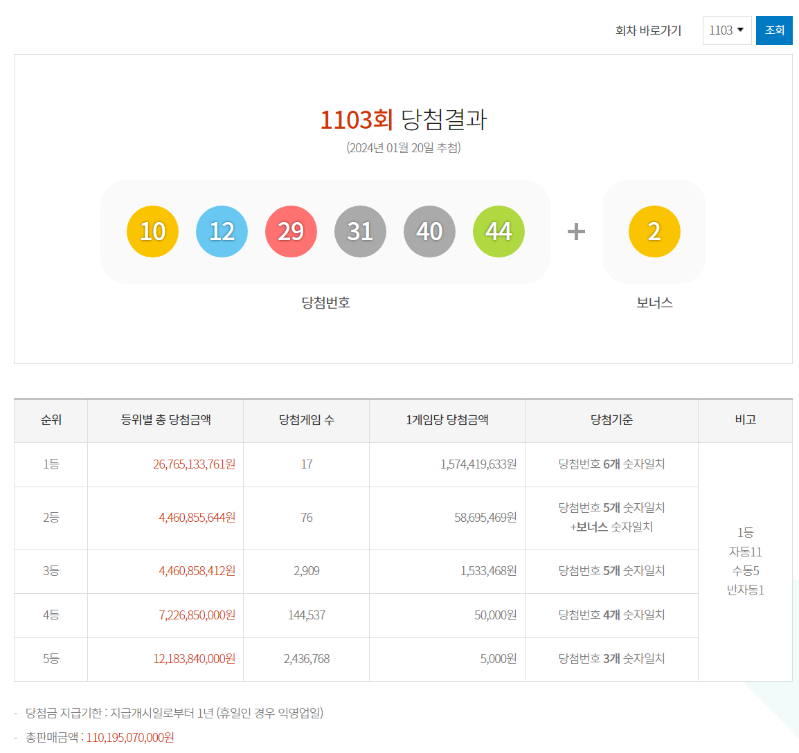 1103회 당첨결과 (2024년 01월 20일 추첨) 당첨번호 10 12 29 31 40 44 1103회 순위별 등위별 총 당첨금액, 당첨게임 수, 1게임당 당첨금액, 당첨기준, 비고 안내 순위 등위별 총 당첨금액 당첨게임 수 1게임