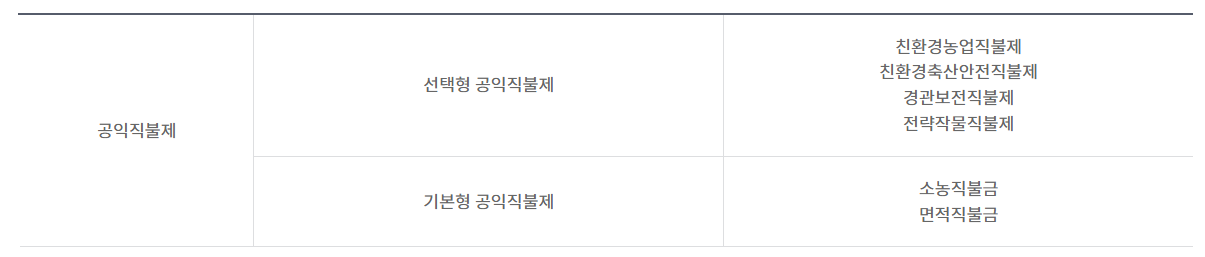 농업활동을 통해 식품안전, 환경보전, 농촌유지 등 공익을 창출하도록 농업인에게 보조금을 지원하는 제도