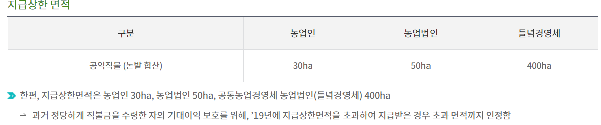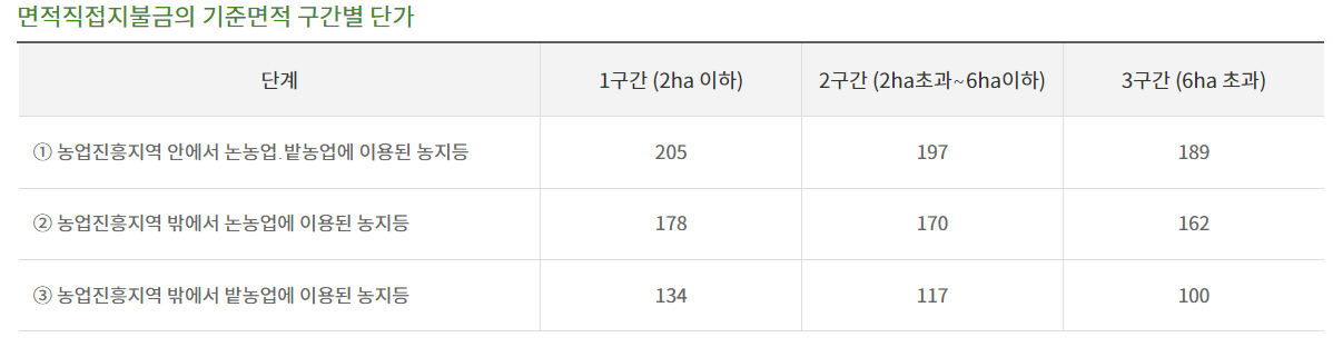 * 면적직불금 : 면적 구간을 나누어 기준면적이 커질수록 지급단가가 낮아지도록 설계