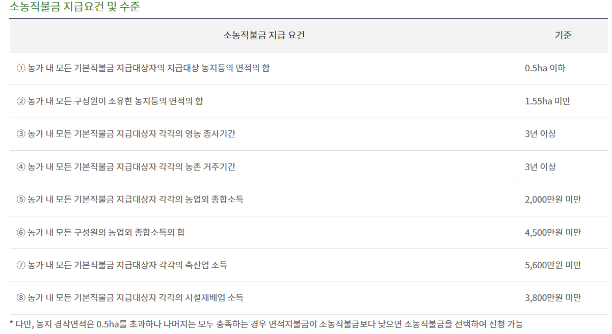* 소농직불금 : 일정 요건(개인 경작면적, 농가 소유면적, 영농 종사기간, 농촌 거주기간, 농외소득 등)을 모두 충족하는 농가에게 면적에 관계없이 120만원 지급