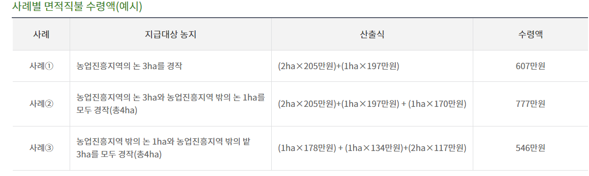 또한, 농업진흥지역과 비진흥지역에서 모두 경작하는 농업인은 「농업진흥지역 논·밭 → 농업진흥지역 밖의 논 → 농업진흥지역 밖의 밭」의 순서대로 구간별 지급단가를 적용하여 직불금 지급