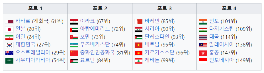 2023 AFC 아시안 컵 결승전 조 추첨은 카타르 도하의 카타라 오페라 하우스에서 2023년 5월 11일에 열렸습니다. 시드배정은 2023년 4월 FIFA 랭킹을 기준으로 합니다.